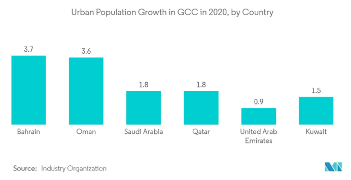 GCC国家的城市人口正在增加。由于农村地区劳动力向城市地区的流动,城市地区的人口密度也在上升。预制建筑市场的增长受到了整个地区建筑活动增加的驱动,以及缺乏为移民提供可负担住房的现状影响。
