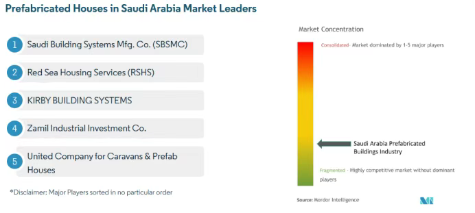 沙特预制建筑市场的主要企业包括:红海房屋(Red Sea Housing)、扎米尔工业(Zamil Industries)、联合房车与预制房屋公司(United Company for Caravans and Prefab Houses)、Al-Shahin Metal Industries以及Kirby Building Systems,这些公司既从事预制建筑市场的制造活动,也涉及承包服务。