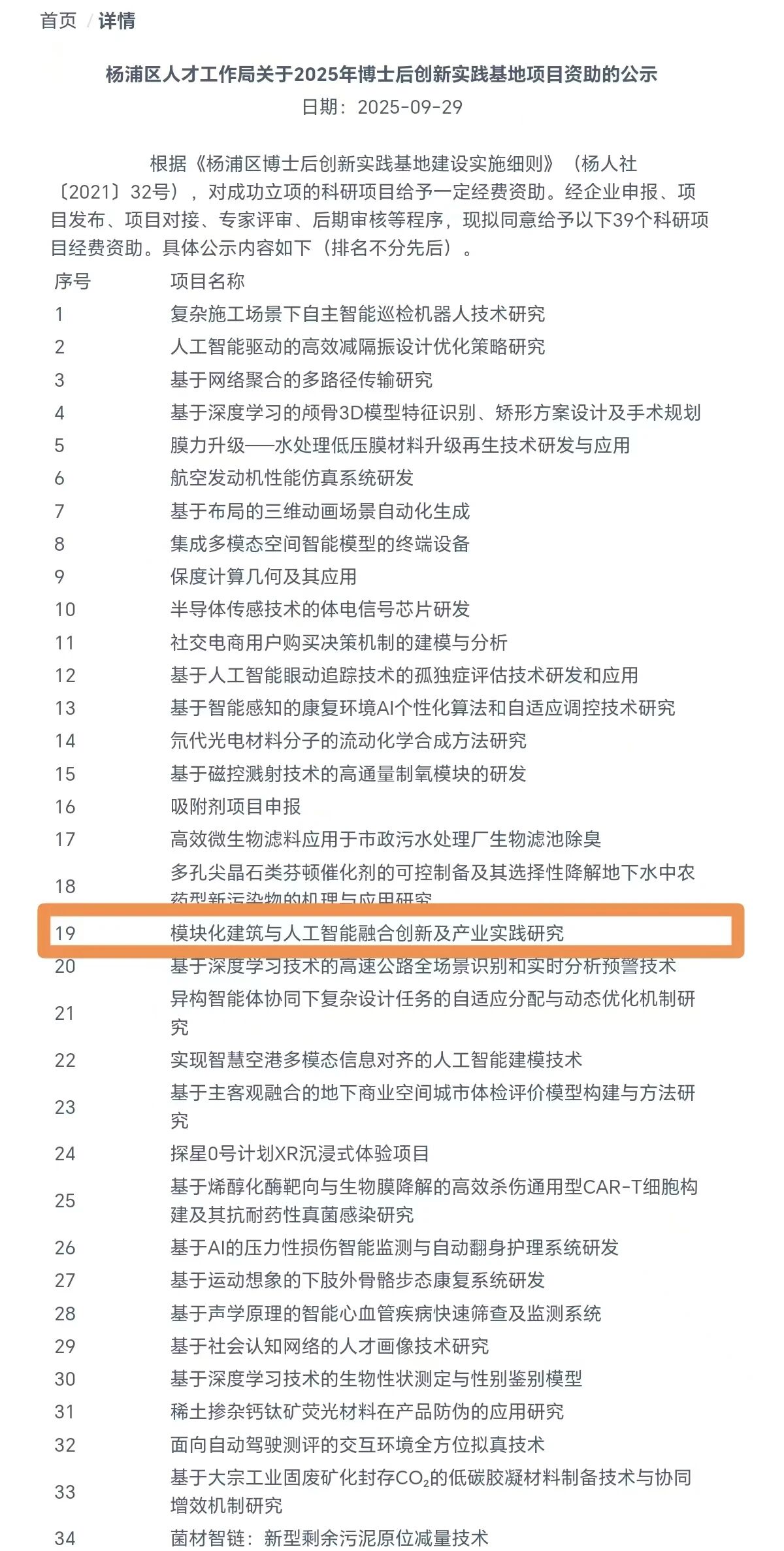2025年9月29日,根据《杨浦区博士后创新实践基地建设实施细则》(杨人社〔2021〕32号),对成功立项的科研项目给予一定经费资助。经企业申报、项目发布、项目对接、专家评审、后期审核等程序,现拟同意给予以下39个科研项目经费资助。