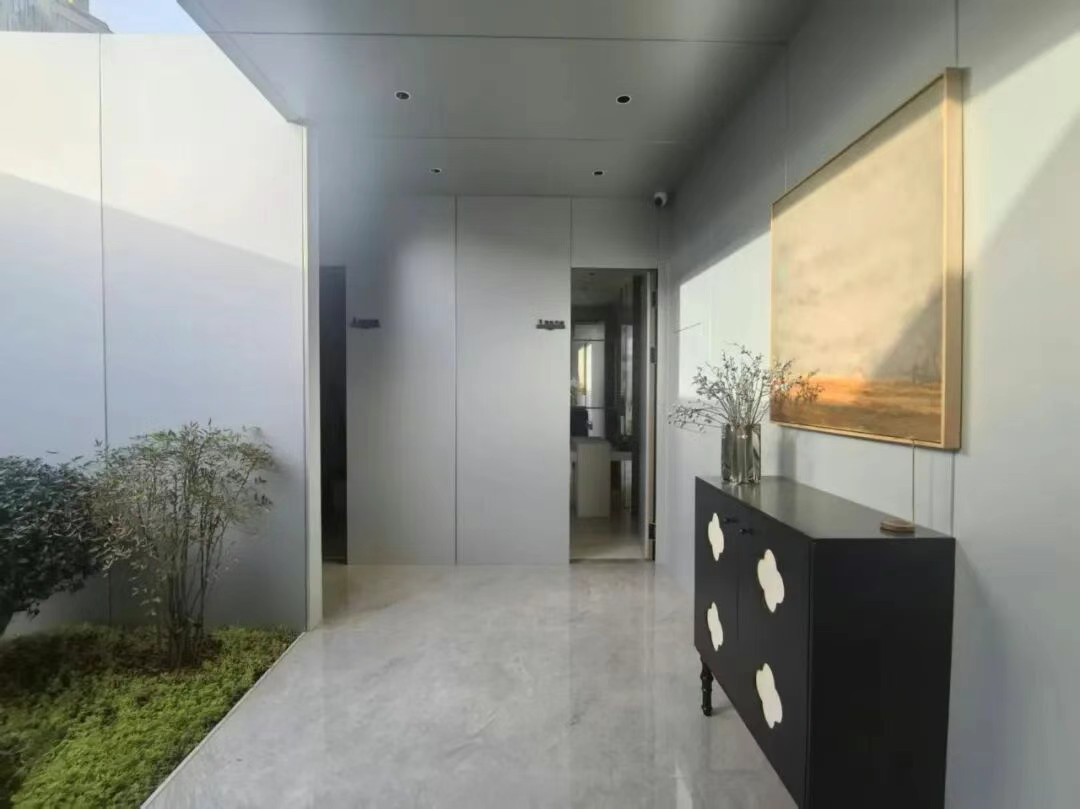 这种“工业化量产+模块化组装”的黑科技,让建筑像搭积木般精准高效。外立面采用苹果手机同款金属银灰色铝复合板,搭配通透玻璃幕墙与园林景观相映成趣,在保证高颜值的同时,实现了构造与功能的完美统一。室内空间虽精巧却五脏俱全,灯膜饰面与不锈钢收口营造出舒适温馨的洽谈氛围,科学的人流规划杜绝空间死角,让每一寸面积都物尽其用。